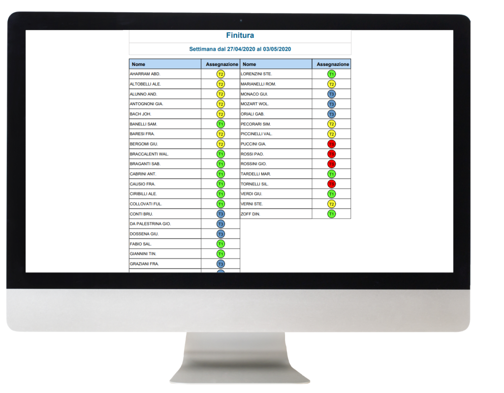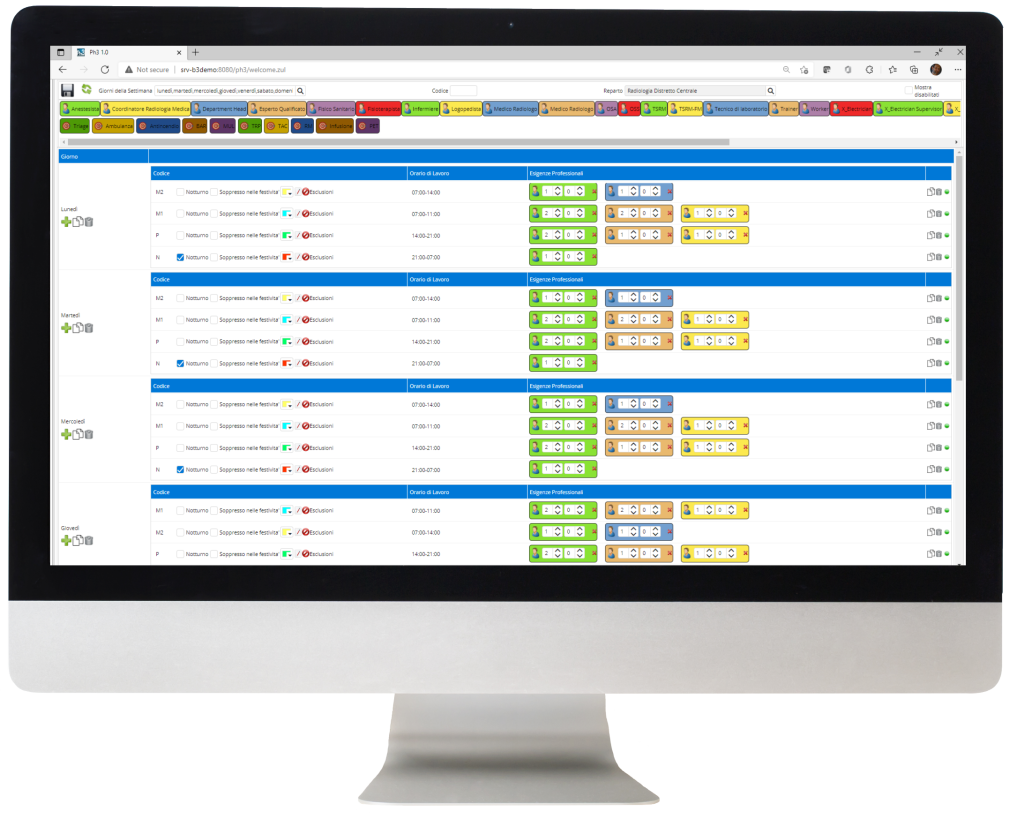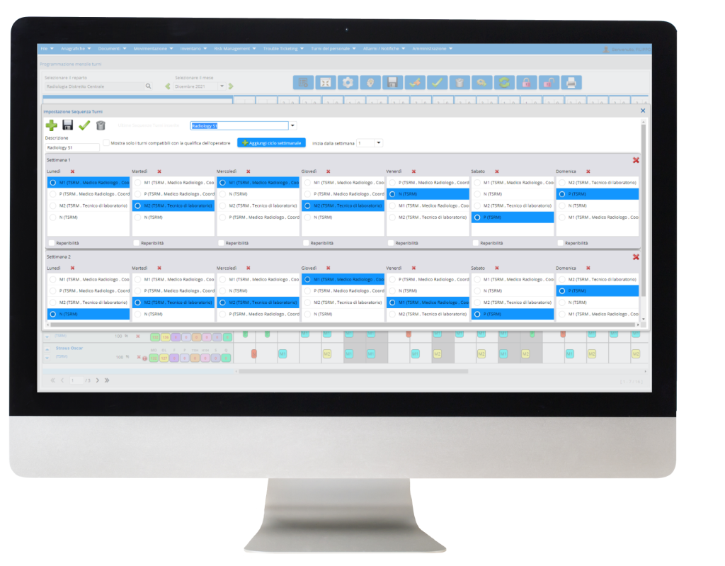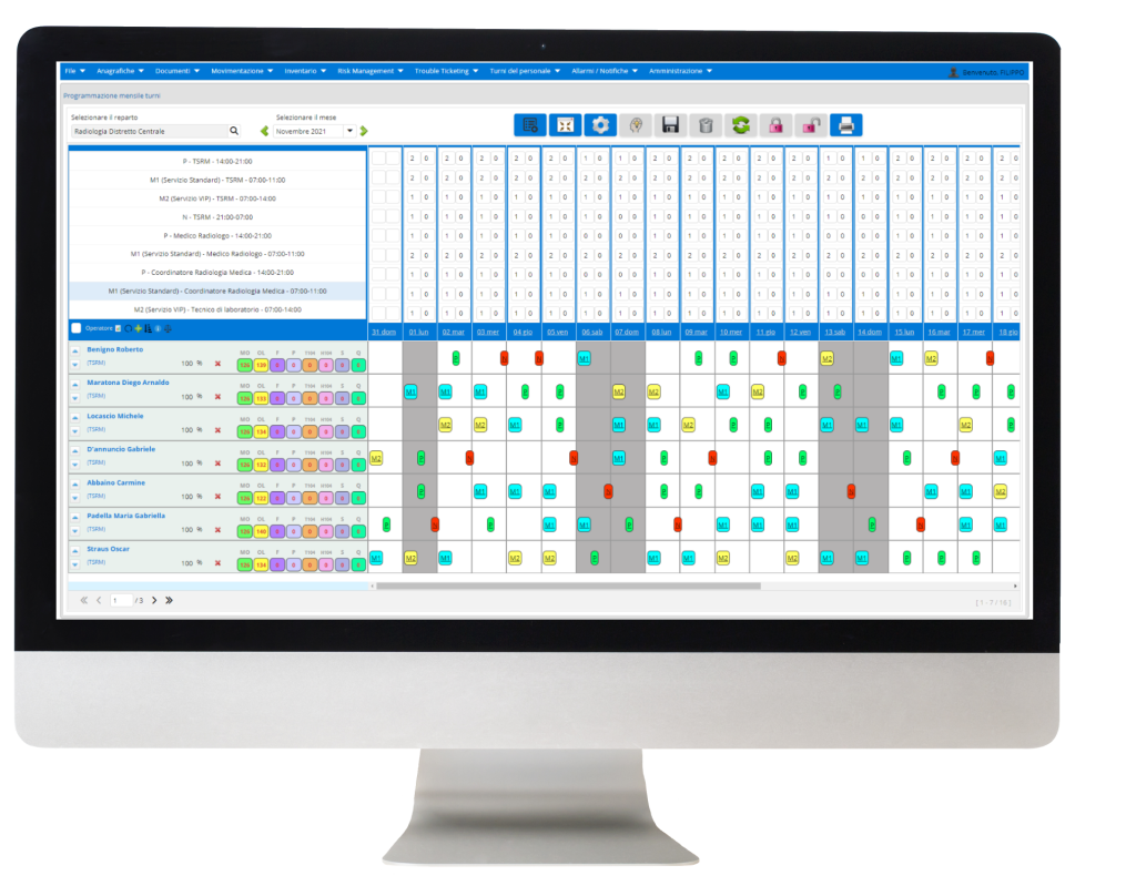 La pianificazione tiene conto di qualifiche professionali, skill, profili specifici di ogni operatore, nel rispetto di tutte le regole e di tutte le linee guida pertinenti (CCNL, ore lavorative, leggi, regolamenti interni, esigenze specifiche di reparto, ecc.).